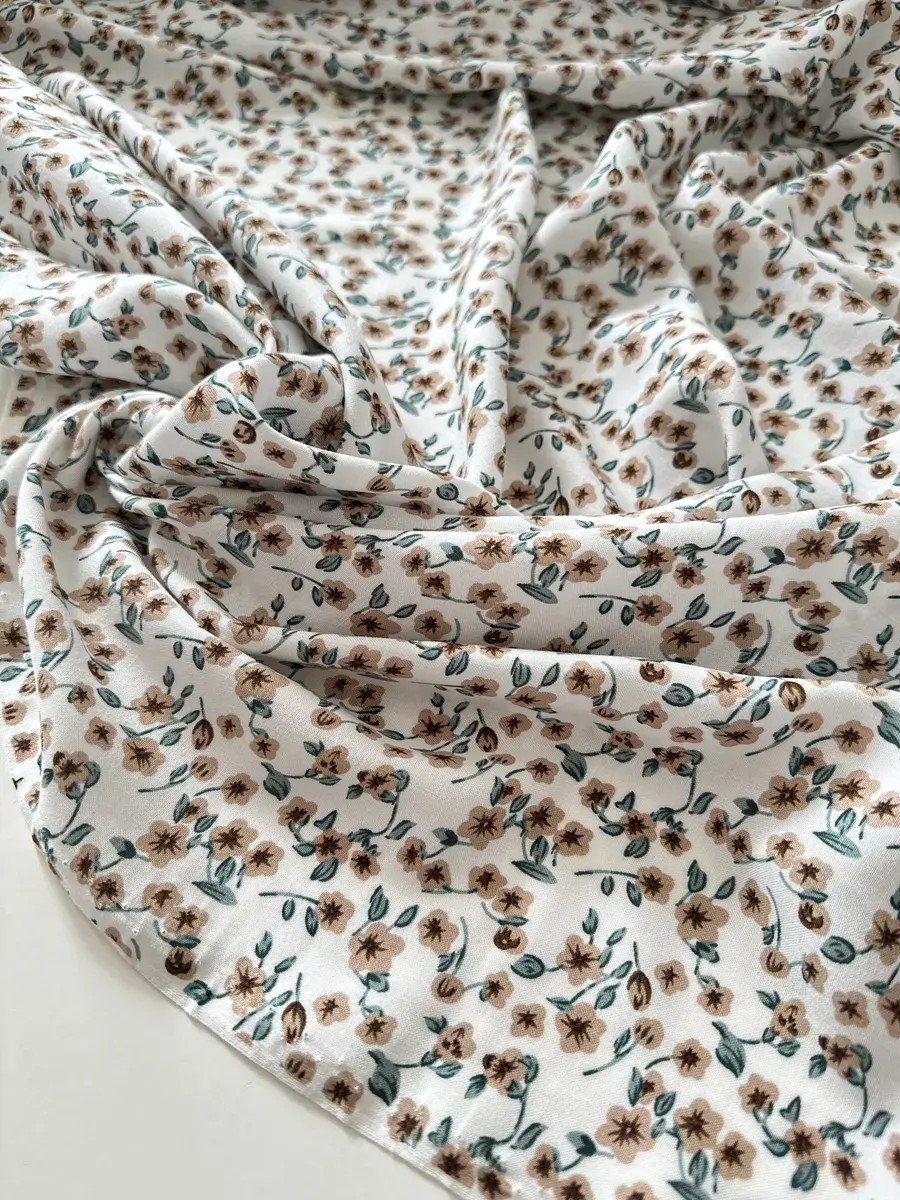 Эта ткань тонкая, без эластана, она не тянется и имеет принт в горошек или мелкий цветок. Она очень приятна к телу, мягко лежит в складках и драпируется. Штапель – прочная и практичная ткань для легкой одежды.