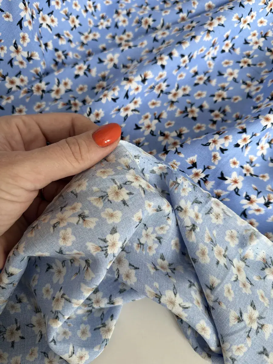 Ткань тонкая, но прочная, без эластана. Она не тянется и не мнется, поэтому ее легко шить и носить. Плотность ткани составляет 110 г/м², что делает ее комфортной для тела и мягкой на ощупь.
