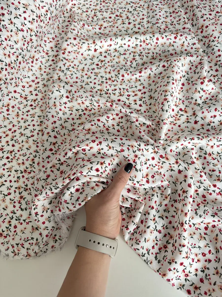 Ткань тонкая, но прочная, без эластана. Она не тянется и не мнется, поэтому ее легко шить и носить. Плотность ткани составляет 110 г/м², что делает ее комфортной для тела и мягкой на ощупь.