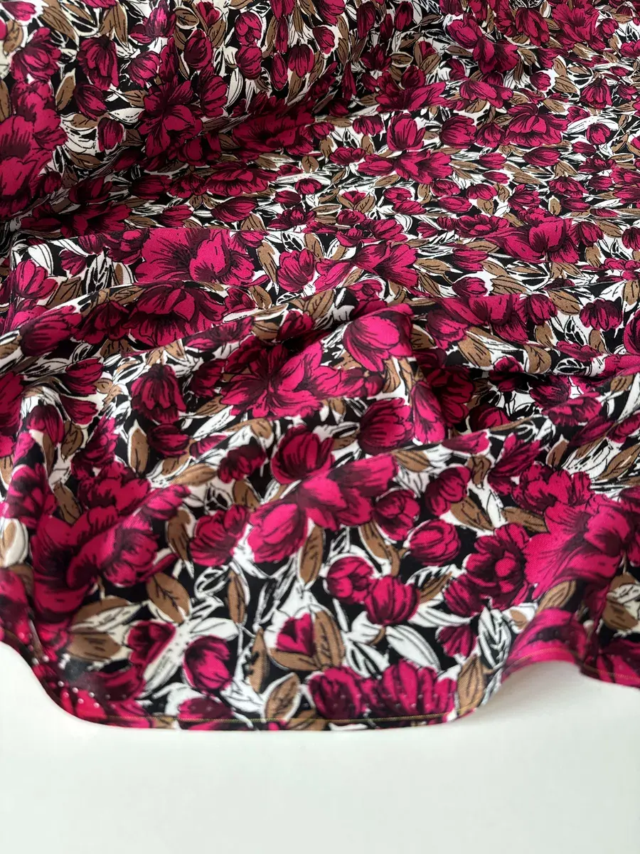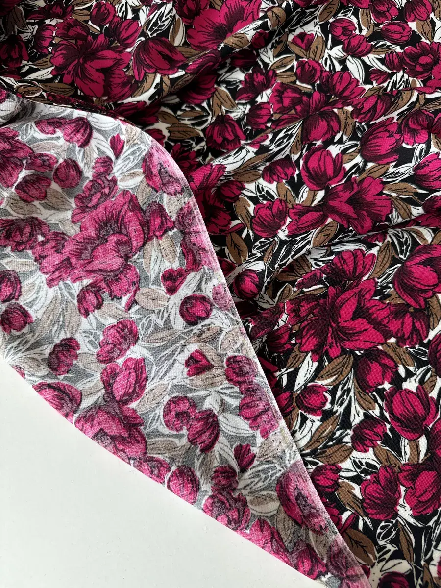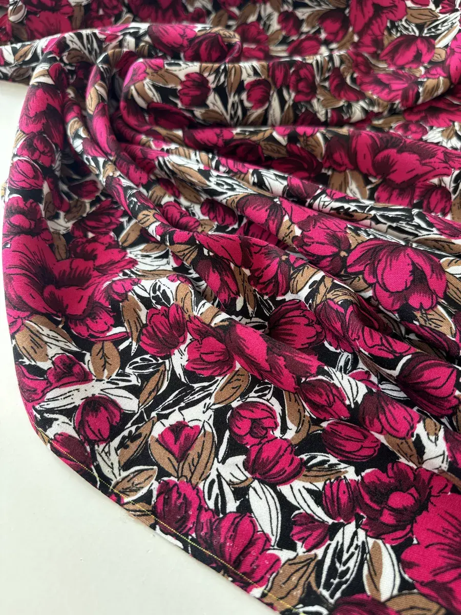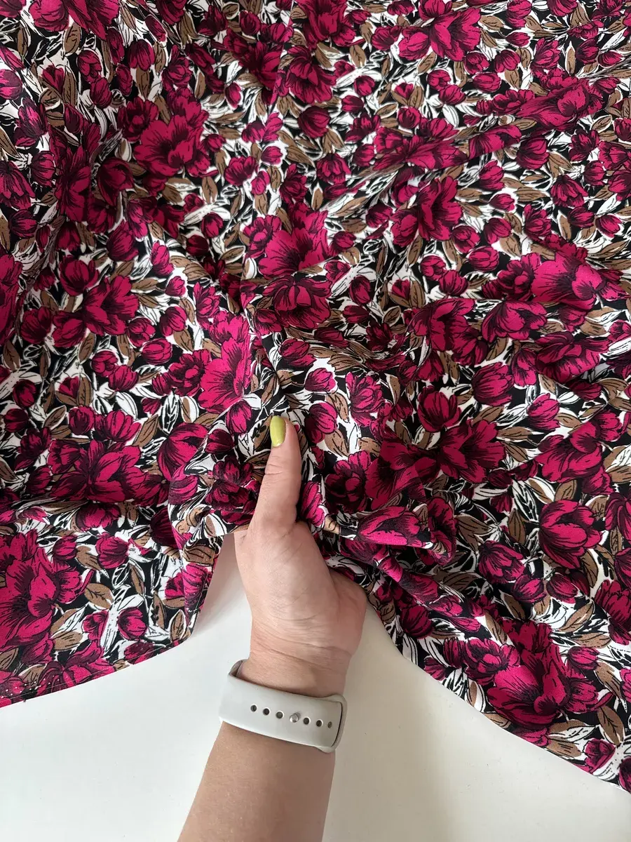 Уход за тканью очень прост: бережная стирка при температуре 30 градусов, отжим не более 600 оборотов в минуту и использование жидких моющих средств. Перед раскроем рекомендуется провести предварительную декатировку полотна. Красивый принт ткани будет отлично смотреться в любой вещи, будь то свободное платье, юбка или блуза!