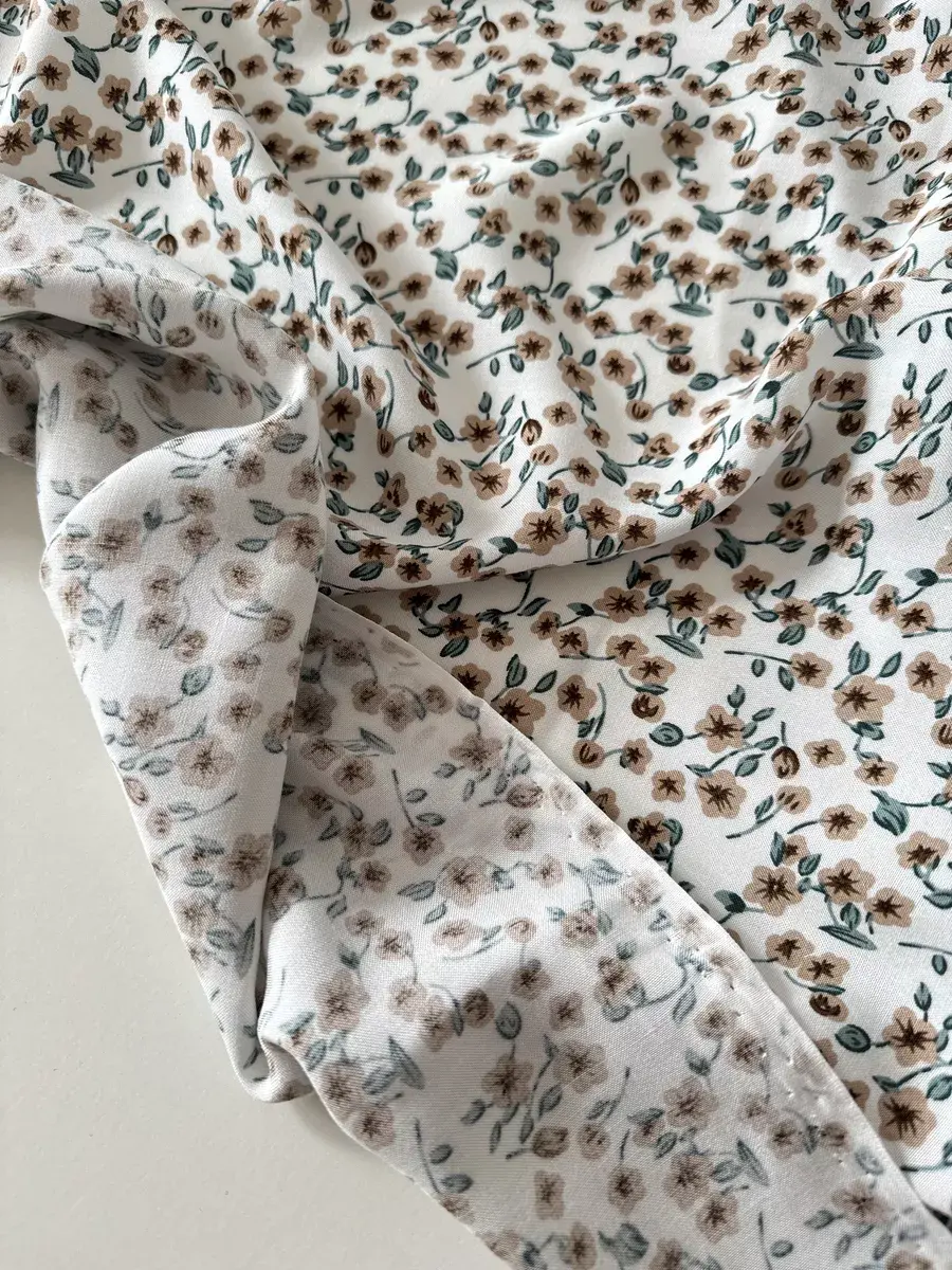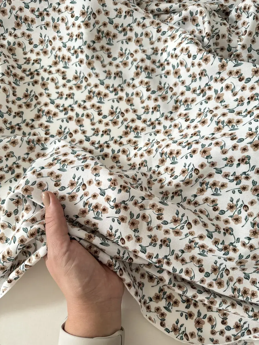 Уход за тканью очень прост: бережная стирка при температуре 30 градусов, отжим не более 600 оборотов в минуту и использование жидких моющих средств. Перед раскроем рекомендуется провести предварительную декатировку полотна. Красивый принт ткани будет отлично смотреться в любой вещи, будь то свободное платье, юбка или блуза!